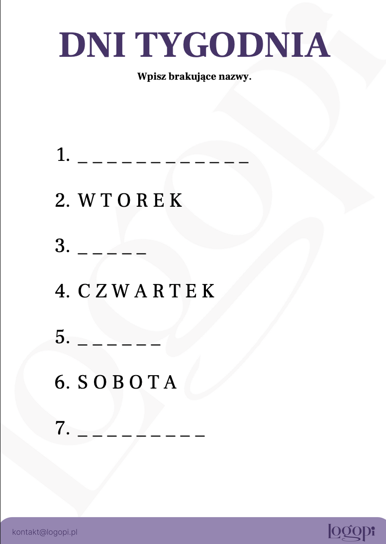 Dni tygodnia – Których dni brakuje Wpisz brakujące nazwy.-7