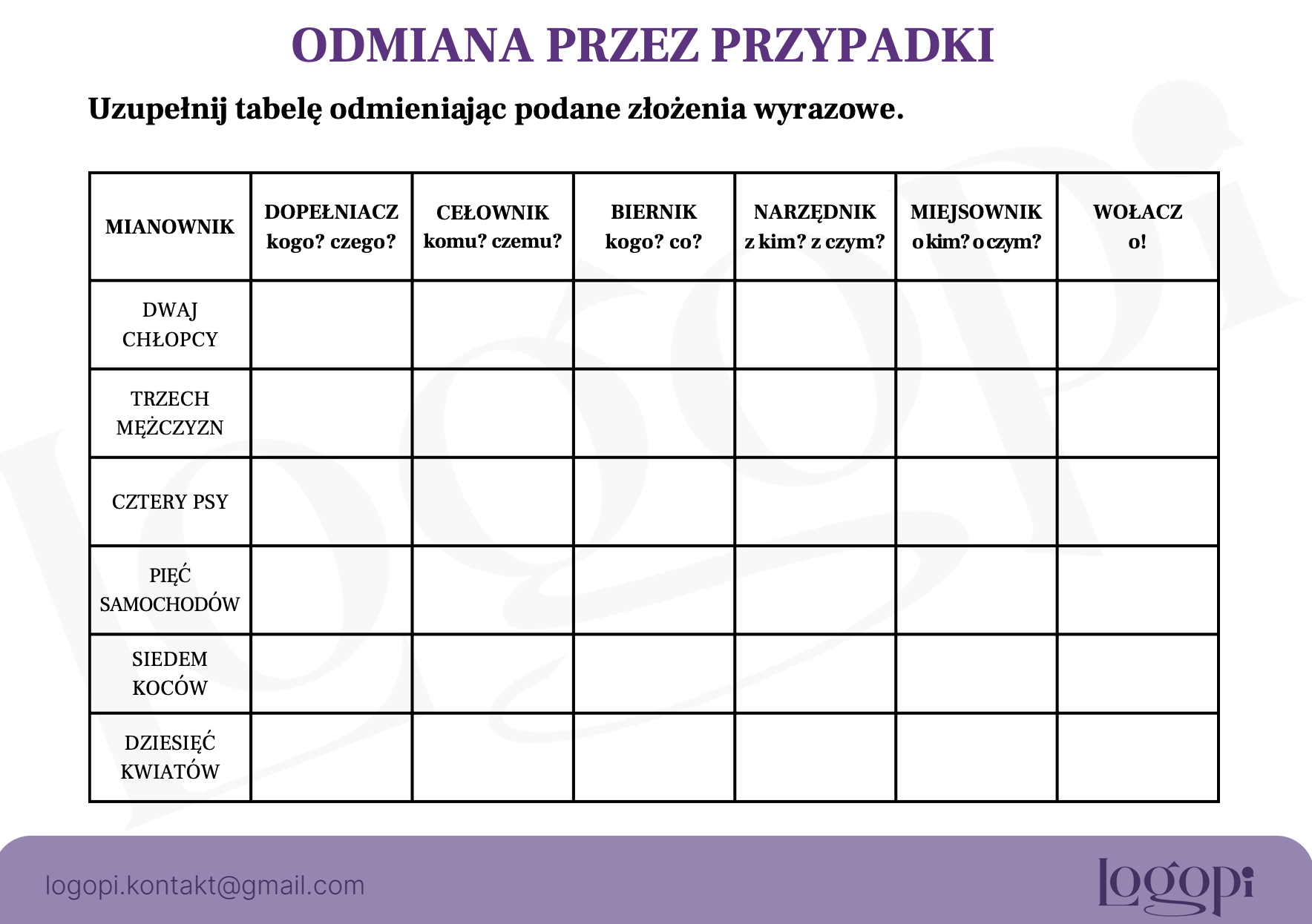 Odmiana przez przypadki – złożenia wyrazowe rzeczownik+liczebnik (liczba pojedyncza i mnoga)6