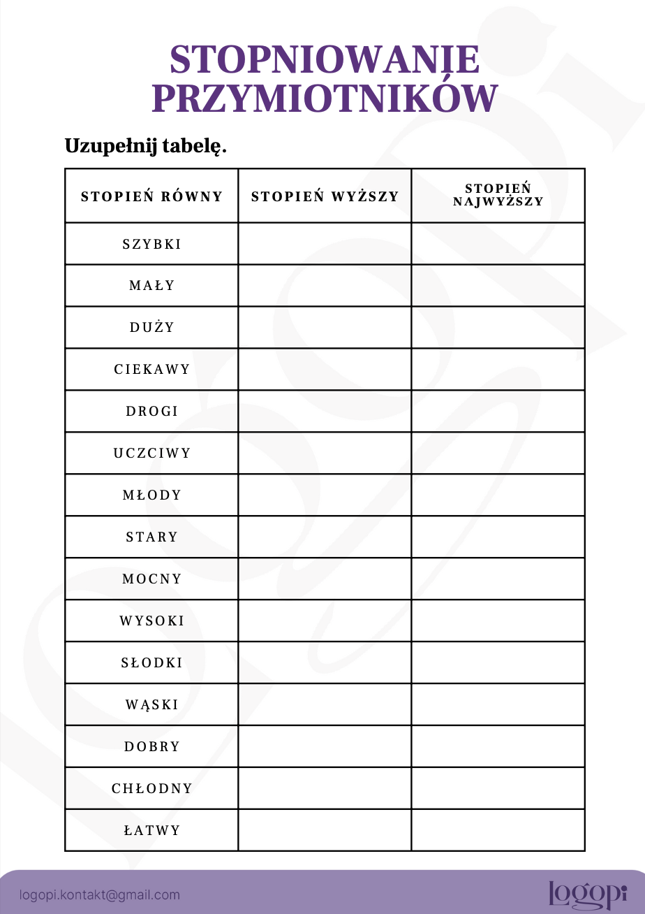 Stopniowanie przymiotników uzupełnij tabelę – dopisz brakujące wyrazy