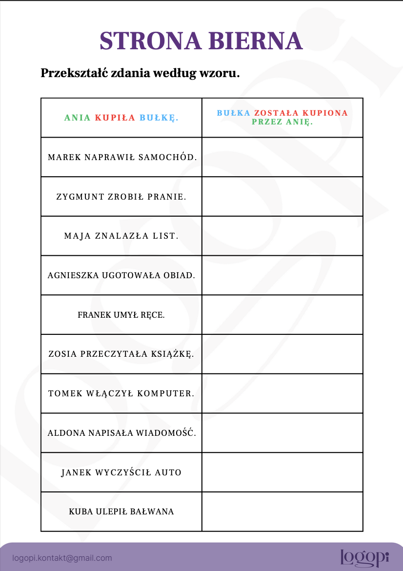 Strona bierna, proste zdania – przekształć według wzoru